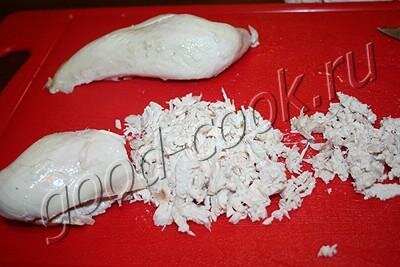 С остывашей грудки снять кожу и вынуть кости.