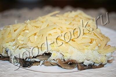 В нём нет ни утяжеляющей картошки, ни острого лука. Единственный вкусовой акцент идёт от сыра. А грибы придают свой аромат всему салату.