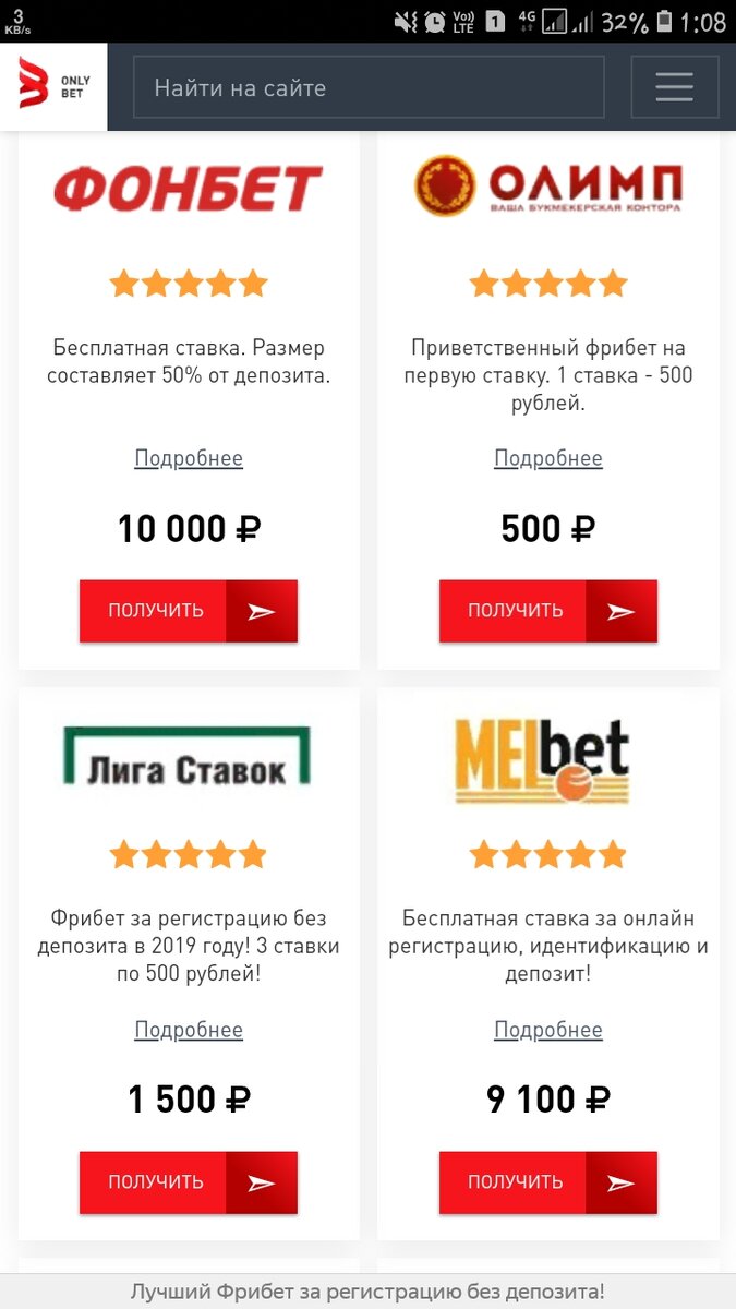 Думаю тем, кто знает, что такое ставки, объяснять про ФРИБЕТ не нужно. А для тех, кто не знает, что это такое и с чем его едят, объясню поподробнее Фрибет-первоначальный бонус для совершении ставки. Иными словами - Бесплатная ставка. На сегодняшний день некоторые букмекерские конторы дают такую возможность. Для этого нужно всего лишь зарегистрироваться и пройти идентификацию в данной БК. (Лирическое отступление - Я никого не призываю и не заставляю, просто делюсь реальным способом заработка и своим опытом.) Для этого : 1) вы должны быть совершеннолетним 2)Иметь Российское гражданство Регистрация занимает минут 20. А сейчас я поделюсь своим УСПЕХОМ. Для начала я зашёл на сайт "Онли бет" Просмотрел какие Конторы предлагают фрибет без депозитов и начал процесс регистрации. Прошу заметить, что у всех условия заключения пари разные. Если хотите подробнее узнать о каждой, я могу сделать отдельный пост. Так вот, пройдя регистрацию, мне осталось самое важное :распорядиться этими сред