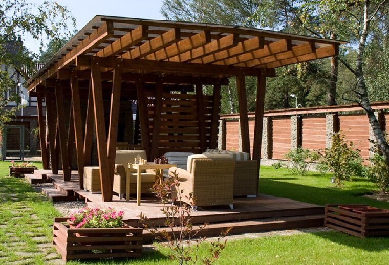 Беседка с односкатной крышей – это не только простой, но и модный вариант. Она может быть отдельно стоящая или в виде пристройки к дому, открытая, полузакрытая или глухая с мангалом или барбекю. Разработка проекта После выбора места для беседки с односкатной крышей необходимо разобраться с типом фундамента. Этот вид построек отличается небольшим весом, поэтому при маленькой площади можно обойтись столбами по углам. При средних размерах устраивается ленточный фундамент. Если строение будет глухое, с мангалом, то основание должно быть плитное. Важный показатель – уклон крыши, который определяется, базируясь на вид кровельного материала, силу ветра, количество осадков. Расчет по материалу: Для регионов с большим количеством снега минимальный уклон 25°. Требуемый показатель обеспечивается разностью высоты стен. Стропильную систему односкатной крыши для беседки необходимо вычислить точно. Обычно к длине стены плюсуется метр (по полметра на передний и задний свес). Шаг между стропилами завис