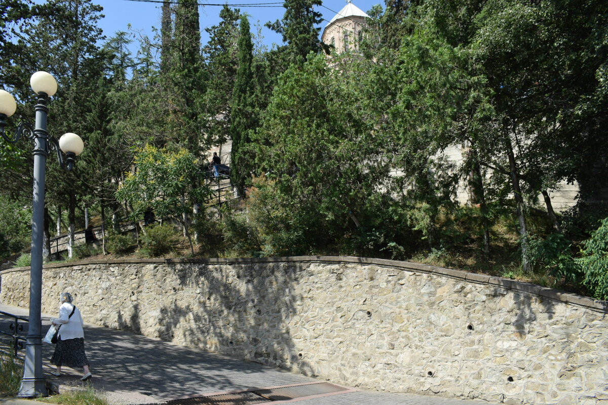 В прошлом году после поездки в Грузию я узнала о тропе, ведущей от парка Мтацминда к крепости Нарикала по вершине хребта. В этом году мы решили найти эту тропу и посмотреть на Тбилиси с нового ракурса. Это первая причина. Вторая причина, по которой мы поперлись на эту гору в том, что через два дня нам предстоял не самый легкий поход в Сванетии и мы хотели проверить свои силы. Перед поездкой мы тщательно спланировали этот день, начать должны были с площади Свободы в 9 утра. Но в планы вмешался неторопливый грузинский завтрак и прогулку по проспекту Руставели пришлось заменить поездкой на такси. Свой путь мы начали у подножия горы Мтацминда. По серпантину поднялись к церкви Святого Давида. Еще в начале подъема нас смутило количество людей, идущих с нами наверх. Оказалось, что в этот день в Грузии отмечают день памяти Святых Ерма, Ермия и Давида. Поэтому у церкви Святого Давида было неожиданно многолюдно и, чтобы не смущать прихожан своим внешним видом (а мы готовились к походу, а не к