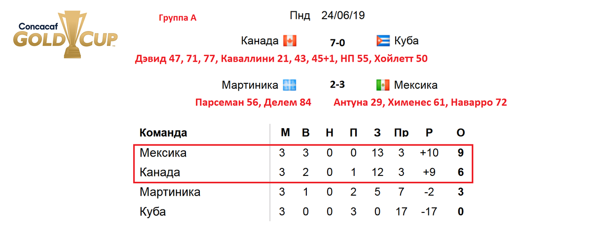3 сборные набрали стопроцентный результат: Мексика, Гаити, США. Кроме этой троицы, не проиграла ещё Ямайка.