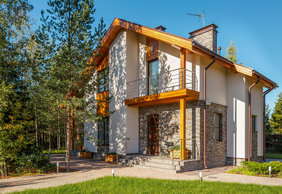 Дом возведен из поризованного кирпича, имеющего прекрасные технические характеристики. Строение установлено на монолитную железобетонную плиту. Крыша покрыта гибкой битумной черепицей. Лаконичные фасады, обыгранные несколькими видами отделочных материалов (штукатуркой, натуральным деревом — скошенным планкеном из лиственницы и камнем), прекрасно вписываются в лесной массив участка. Коттедж выглядит современным и достаточно ярким в любую петербургскую погоду.