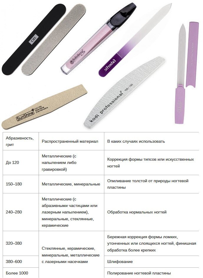 Все мы знаем, что пилочка — это главный атрибут в индустрии маникюра! Без них не обходится ни одна девушка! С их помощью можно легко изменить форму или длину ногтя. В магазинах предоставлен большой ассортимент пилок разных форм, основ и жесткости. Но как же подобрать этот инструмент? Сейчас мы с вами разберемся! Абразивность (жесткость) определяется степенью нанесенного на нее напыления. Она измеряется в гритах — это можно заметить на самой пилочке или упаковке. Низкий коэффициент говорит о том, что поверхность жесткая. Если абразивность составляет от 60 до 240, то пилка подойдет для искусственных ногтей, так как натуральный ноготь может испортить. Невысокая жесткость говорит о том, что она предназначена для натуральных ногтей. Также существуют еще и полировочные пилки, а их абразивность составляет 900 грит и выше — она придает блеск ногтям. Но злоупотреблять полировщиками не нужно, так как можно испортить ноготь они начнут слоиться. Выбрать именно нужную пилку достаточно сложно, так