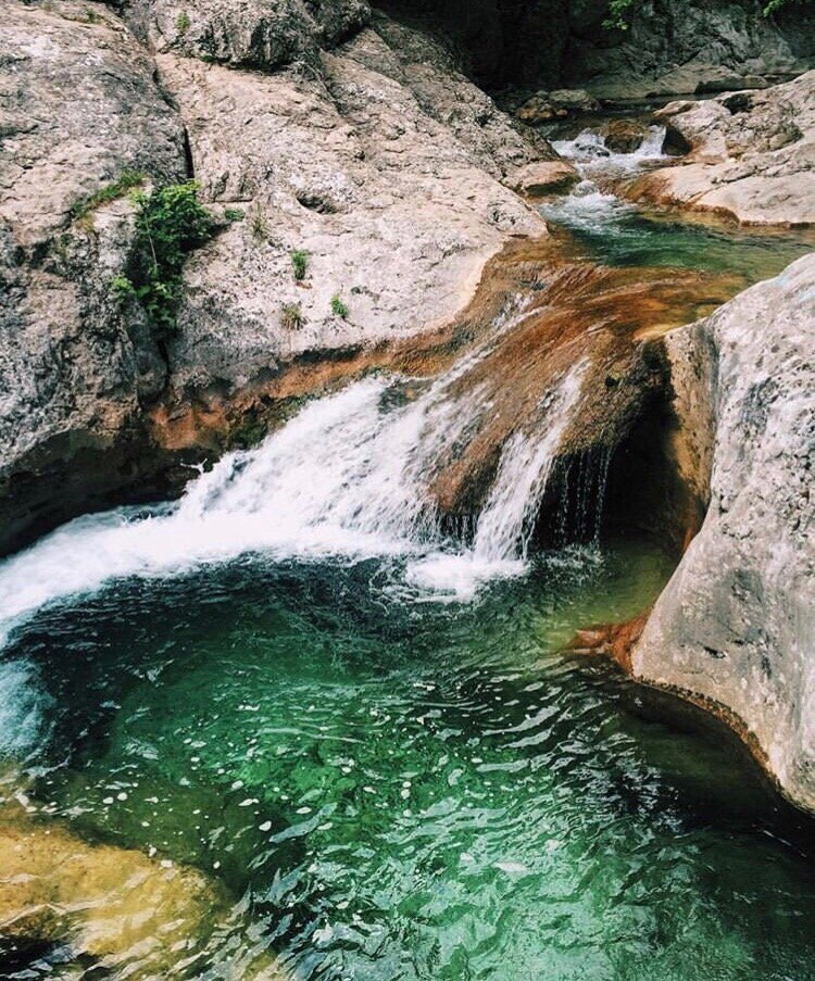 Речка Аузу-Узень, текущая по дну каньона, кристально чистая и с потрясающими переливами цвета от голубого до глубокого изумрудного, контрастирует с рыжими каменистыми берегами и гармонично сочетается с насыщенной зеленью лесов) Дорога до каньона довольно сложная, по горному серпантину. С южного берега Крыма подъем на Ай-Петри, а затем спуск на дно каньона))) В общей сложности 40-45км!