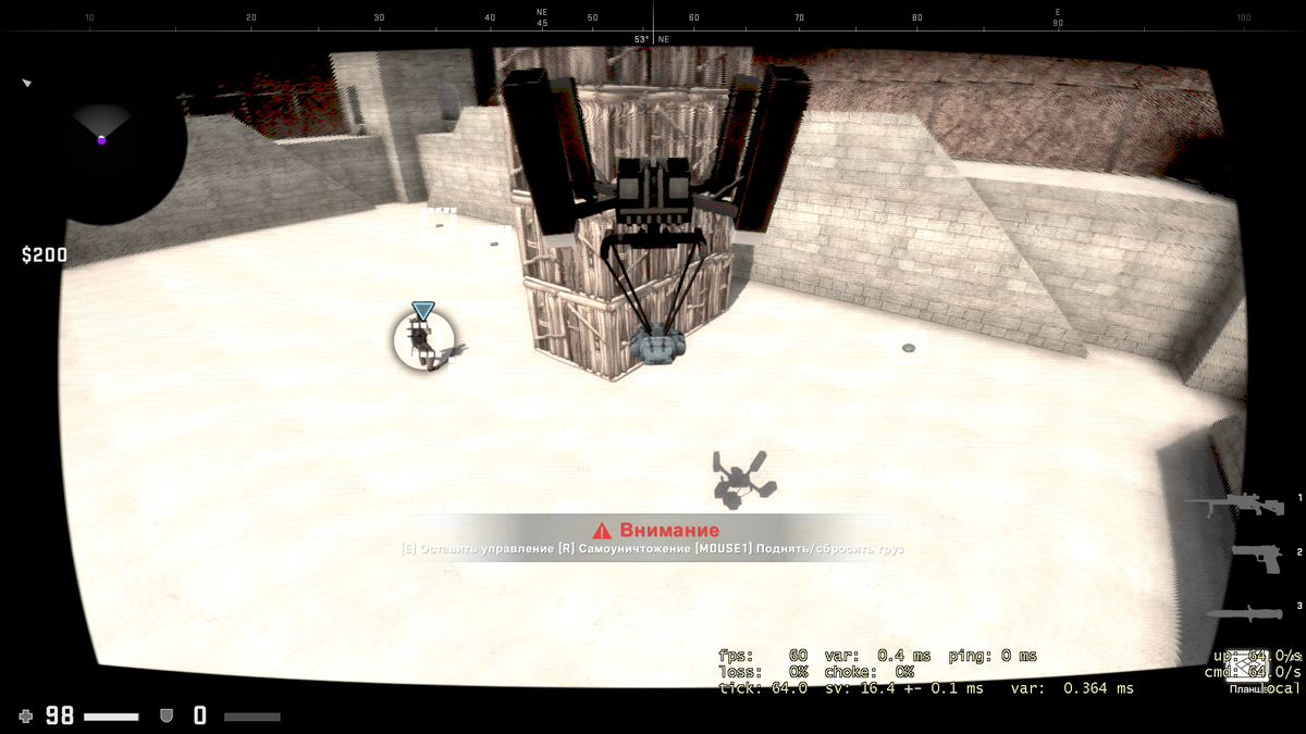 Как известно всем в CS:GO есть "Королевская битва" или же "Запретная зона". В недавнем обновлении CS:GO для "Запретной зоны" были добавлены начальные предметы которые выбираются во время высадки. Одним из этих начальных предметов является "Управление дроном". Наверно много человек задавалось вопросом как управлять дроном вне "Запретной зоны"(нет).Так вот для начала заходим на карту и пишем sv_cheats 1 , потом прописываем в консоль команды game_type 6 и game_mode 0 . Позже выдаем себе планшет командой give weapon_tablet . Заходим в планшет и покупаем улучшение планшета "управление дроном" и спавним дронов командой ent_create drone Это конец так , что если понравилось руководство не забудьте поддержать автора.