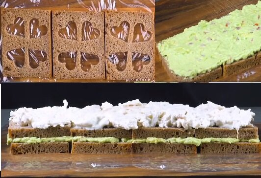 сок половинки лимона Начинка для нашего торта: первая: Готовим соус гуакамоле, мелко нарезаем помидоры, чистим авокадо, добавляем творожный сыр, сок лимона и специи. Все тщательно перемешиваем. Можно в блендере до однородной массы. Вторая: куринную грудку режем на мелкие волокна, смешиваем с творожным сыром до однородной массы Буханку хлеба нарезаем на ломтики, корку срезаем. На первых трех-четырех ломтиках с помощью фигурной формочки вырезаем, например, сердечки Расстилаем пищевую пленку и выкладываем ломтики хлеба, наносим н