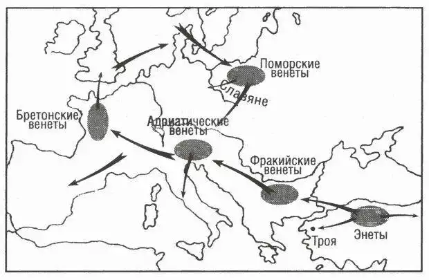 Из Верхней Адриатики значительная часть венетов двинулась дальше на запад. За несколько столетий до н. э. они прочно обосновались в галльской Арморике (нынешней французской Бретани), заняв среди местных племен главенствующее положение, не ускользнувшее от проницательного взгляда Юлия Цезаря. «Это племя, — пишет он в «Записках о Галльской войне», — пользуется наибольшим влиянием по всему морскому побережью, так как венеты располагают самым большим числом кораблей, на которых они ходят в Британию, а также превосходят остальных галлов знанием морского дела и опытностью в нём... Они сделали своими данниками всех плавающих по этому морю».