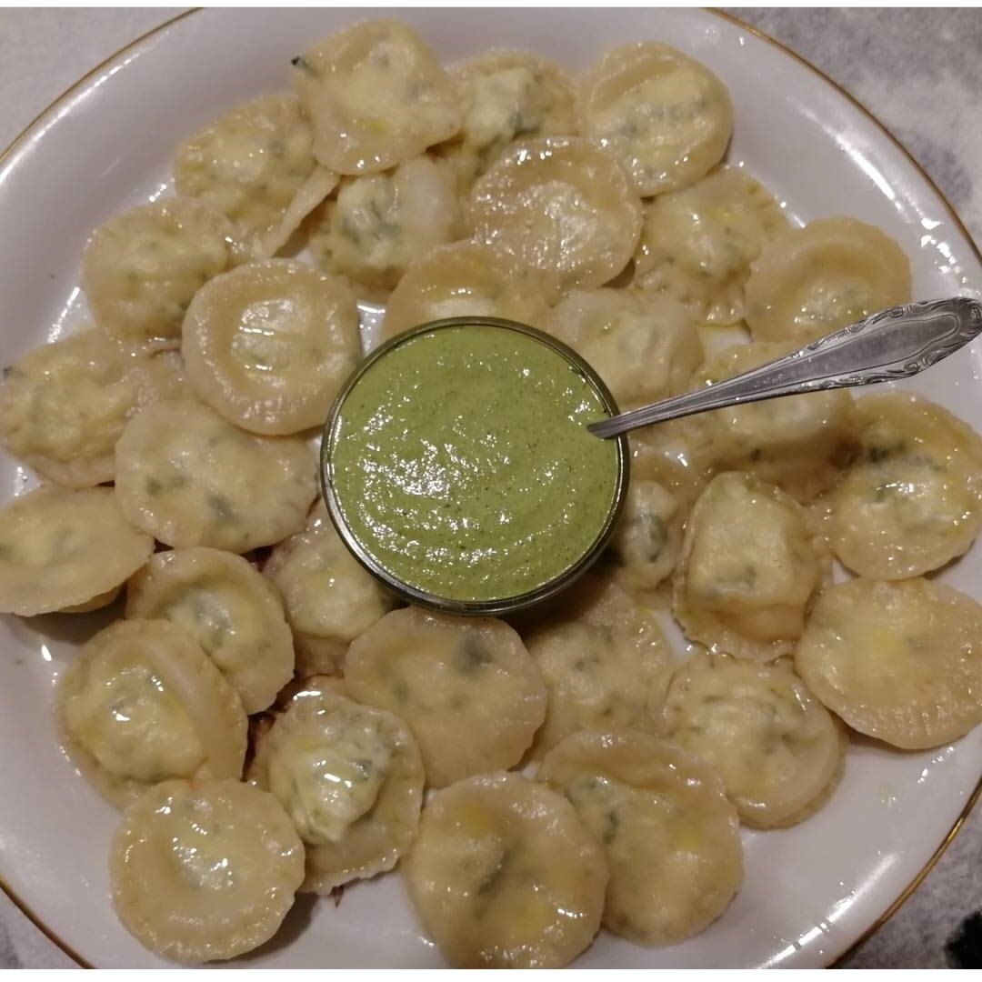 Одной волшебной ложкой оливкового масла тесто на пельмени превращается, превращается тесто ... в равиоли! У меня вчера осталось немного теста. В него я вмесила ложку оливкового масла и ещё немного муки. Тесто стало более плотным и тугим. Ночь расстаивалось в холодильнике. НАЧИНКА (на 40 штук). Как готовим: 1. Творог размять вилкой, пармезан и чеснок натереть на мелкой тёрке. Петрушку порезать, а сухой розмарин растереть в порошок. Все смешать и посолить. Убрать в холодильник на 10-15 минут. 2. Тесто раскатать в тонкий пласт. На половину выложить начинку, по одной чайной ложке на расстоянии 2-3 см друг от друга. Накрыть второй частью пласта, максимально плотно склеить половинки теста. Выдавить кружочки( я использовала рюмочку) либо нарезать ножом для теста на квадраты. Края закрепить вилкой. 4. Варить в подсоленной кипящей воде с ложкой оливкового масла до всплывания плюс 1-2 минуты. Подала с невероятным ореховым соусом. Его рецепт размещен здесь. Приятного аппетита!