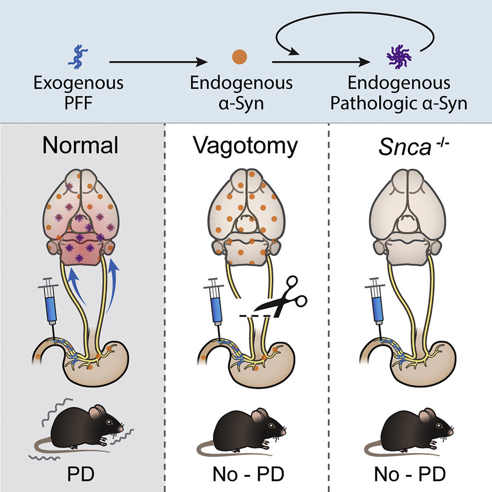 Графический абстракт работы: введение в мышцы двенадцатиперстной кишки фибрилл альфа-синуклеина мышам приводило в итоге к симптомам болезни Паркинсона. Пересечение блуждающего нерва или отсутствие альфа-синуклеина в нейронах самих мышей не дает распространиться болезни. Kim et al, Neuron.2019