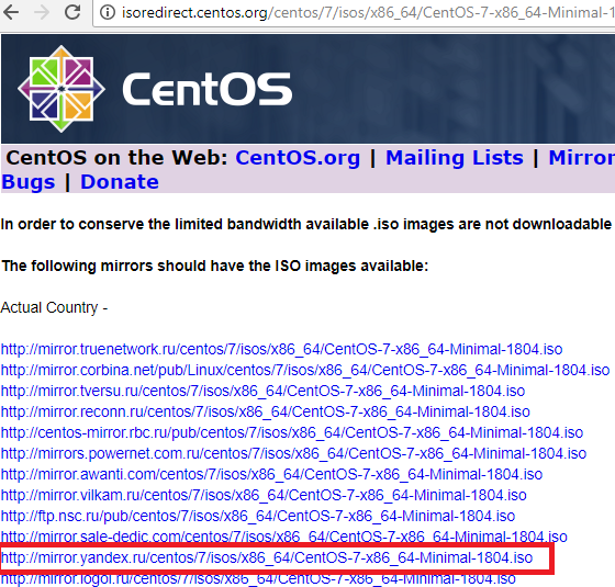 Скачиваем дистрибутив http://mirror.yandex.ru/centos/7/isos/x86_64/CentOS-7-x86_64-Minimal-1804.iso