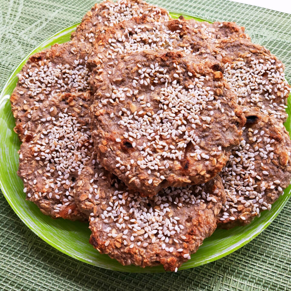 Люблю это печенье за вкус и простоту в приготовлении, а о пользе даже и говорить не стоит. КБЖУ на 1 печенье: 99/3/1/20 Очищаем и пюрируем бананы. Овсяные хлопья немного измельчить по желанию. Добавить в банановое пюре. Можете добавить любые орехи и сухофрукты, я делала с курагой. Всыпаем немного ванилина. Всё хорошо перемешиваем. Выкладываем на противень ложкой или руками, смоченными в воде. Я выпекаю на силиконовом коврике. Можно застелить пергаментом или смазать противень растительным маслом. Сверху печенье присыпаем кунжутом, если любите. Ставим в разогретую до 190°С духовку примерно на 25 минут. Смотрите, как печенье подрумянится. Короткий видео-рецепт здесь: Ингредиенты на 9 штук: 4 маленьких банана (или 2 крупных) 160г овсяных хлопьев сухофрукты, орехи по желанию кунжут на обсыпку по желанию ванилин