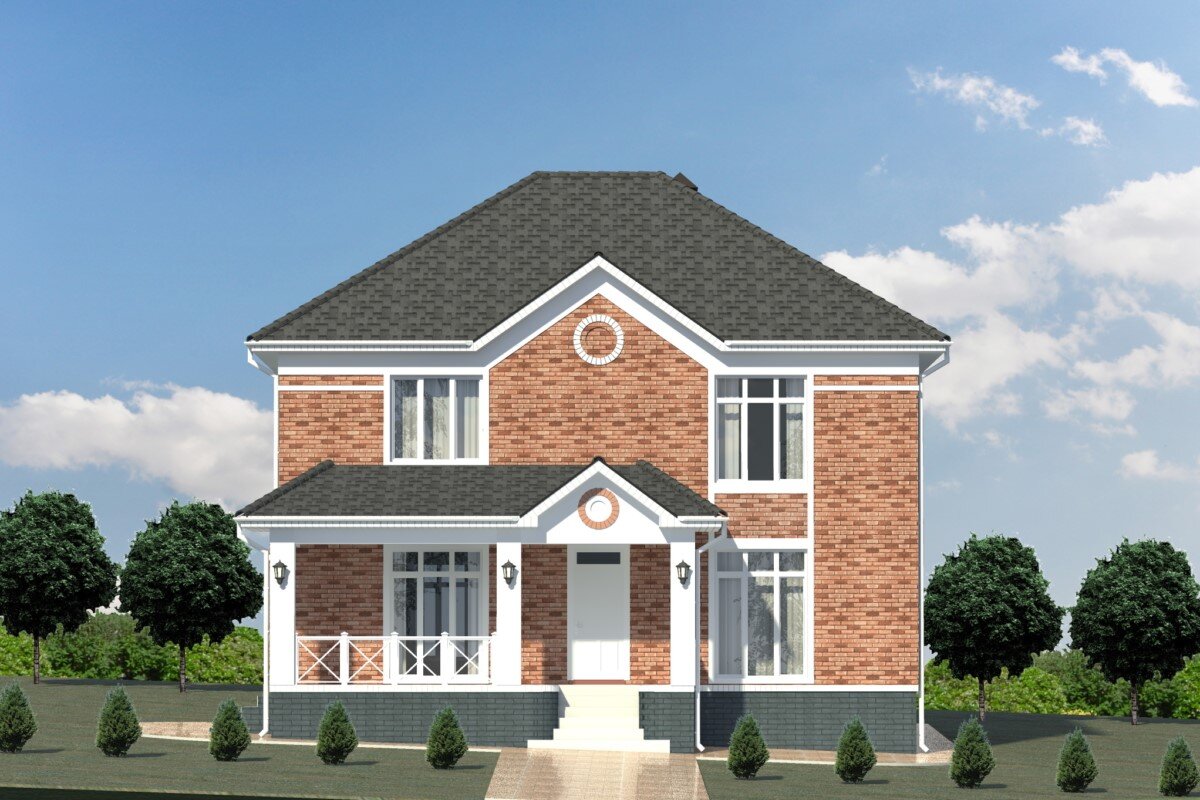 В этот дом невозможно не влюбиться с первого взгляда. На желто-терракотовом фасаде белоснежным цветом сияют оконные переплеты. Конструктив данного проекта (фундамент, стены, кровля и т.д.) будет заменён под Ваши пожелания и климатические условия региона застройки. Внесение этих изменений входит в базовую стоимость проекта. Стоимость проекта: 16 000₽ Медальоны под кровлей дома и веранды придают облику строения вид барской усадьбы. Впечатление усиливают стройные колонны, оживленные «капельками» светильников. Крыльцо располагается под общей крышей с террасой (23,40 м2). На площадку ведут центральные и боковые ступени. По обе стороны парадной двери расположены панорамные окна. Справа – французское с выходом из гостиной, слева – его имитация. Простор и свет В большом доме практически нет темных углов. Внутреннее пространство наполнено дневным светом, потому что окна есть в каждом помещении, даже в санузлах и подсобке. По замыслу архитектора, между кухней, гостиной и коридором практически