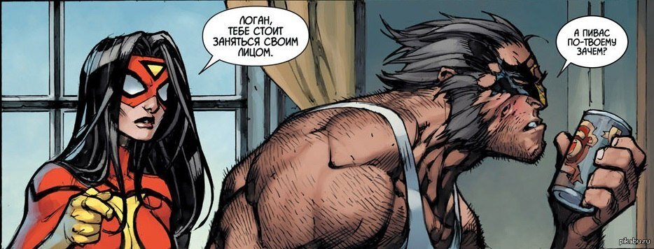Суровый, беспощадный, иногда жестокий, но справедливый алкоголик Зависимость психологическая. Дело в том, что исцеляющий фактор не даёт ему как следует нажраться, как бы ему не хотелось. Достаточно быстро трезвеет, но он очень старается. Суровости его удивлялись многие герои. А расправы над бандитами происходят похлеще,чем в фильмах Стивена Сигала. Но простым людям часто хватает и простых разговоров: Теперь о способностях и нюансах: Исцеляющий фактор слабее, чем у Дэдпула, хотя должен быть таким же. Дело в том, что адамантий ядовит и существенно замедляет регенерацию. При этом может навалять самому Халку. В этом комиксе Халк разорвал пополам Логана и выбросил его ноги километров на 10-20 от второй половины Роси. Искать их пришлось по запаху. Заклятый враг и родственник: Преследует его с какими-то странными целями последние лет 150. Сын: Дакен-Бисексуал. И это никак не связано с тем, что Логану пришлось его убить. Пацан сам нарвался. Способен выжить в условиях дикой природы и крайнего
