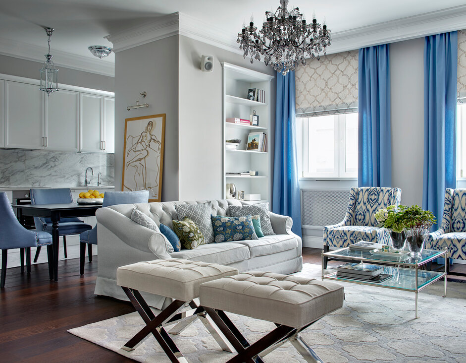 Поговорим о текстильном оформлении дома в такой цветовой гамме, как сине-серо-голубой. Гамма сложная, требующая светлого оформления и ярких декоративных акцентов. Однако, получается изумительно. В данном интерьере мы видим портьерную ткань из пыльного синего жаккарда в паре с римскими шторами с рисунком в виде венецианской решетки. Акцентные парные кресла с принтом в технике икат и декоративные подушки с геометрическими и цветочными паттернами вперемешку с однотонными элементами. Такой интерьер требует много белого и матового, в то числе и ковер из из 100 % новозеландской шерсти, выполненный в технике двухуровнего разрезного ворса. Небольшие вкрапления хрома в отделке мебели и аксессуаров разбавляют холодную палитру создавая контраст. Вот такие ткани нашего второго салона можно сюда интегрировать: 1. Fubricut (США). Хлопок с объемной вышивкой.