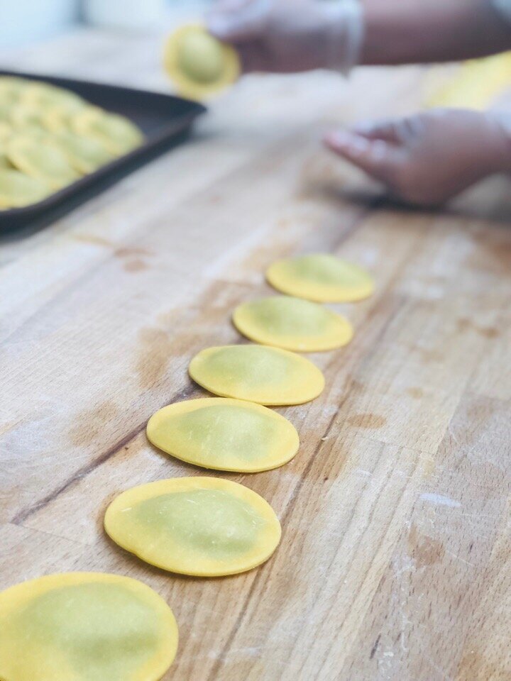 Как известно, визитной карточкой Италии является паста. Одной из разновидностей ее является равиоли. Первые упоминания о данном блюде исходят еще с 18 века. На 4 порции Вам понадобится: • Шпинат (замороженный) -100 гр • Лук репчатый- 70 гр • Сыр Рикотта- 200 гр • Соль/ перец/ мускатный орех по вкусу Залогом у спешного приготовления равиоли служит правильное приготовление теста . Для теста потребуется: • Яйцо куриное - 5 шт • Оливковое масло-15 гр • Молоко 3,2% жирности- 30 мл • Мука пшеничная- 170 гр Начнем с теста. Для теста лучше использовать только желтки яиц для более яркого цвета и нежного вкуса теста. Отделяем желтки от белков, в миске смешиваем желтки с молоком, приливаем оливковое масло и просеиваем муку. Замешиваем тесто , придаем округлую форму, закрываем пленкой и даем "отдохнуть" тесту 20 минут. Тем временем займемся начинкой. Размороженный шпинат отжимаем от излишней влаги, мелко нарезаем репчатый лук и обжариваем до золотистого цвета. Смешиваем отжатый шпинат,