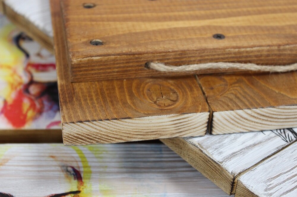 1) Без белого — гладкая древесина, наносится изображение без белого цвета, затем доски покрываются лаком и пропиткой. На месте белого цвета, будет оставаться текстура дерева.