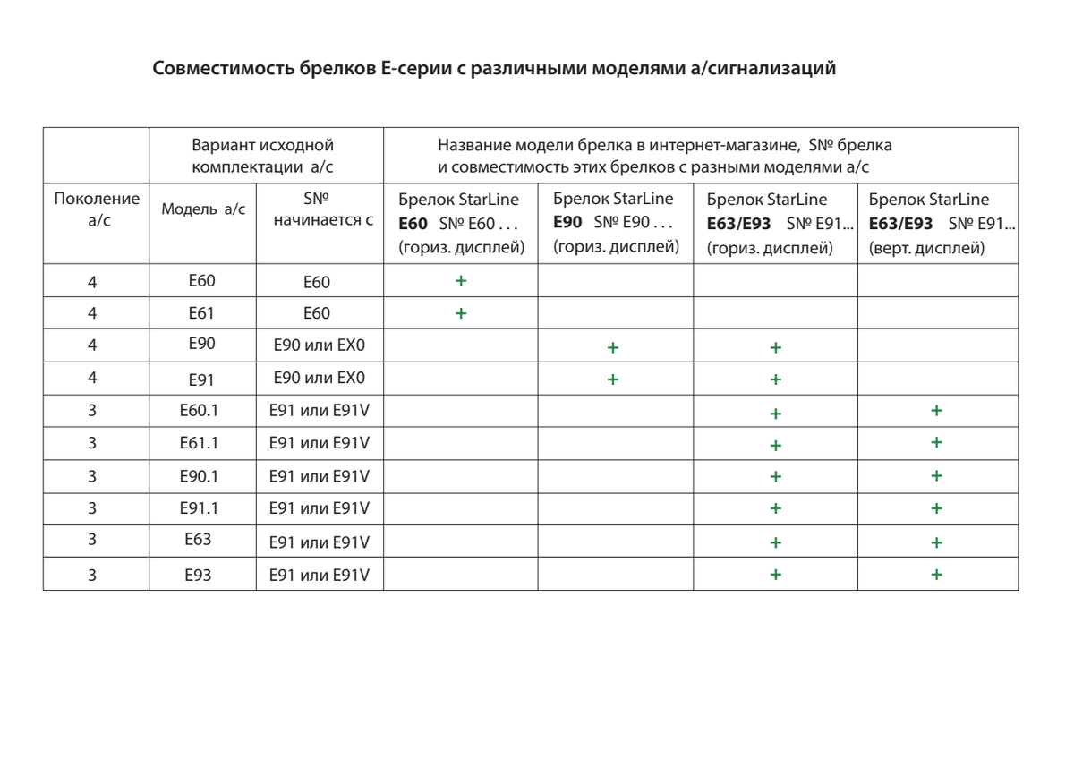 Совместимость брелков Старлайн (StarLine) E60/E90/61/93/63