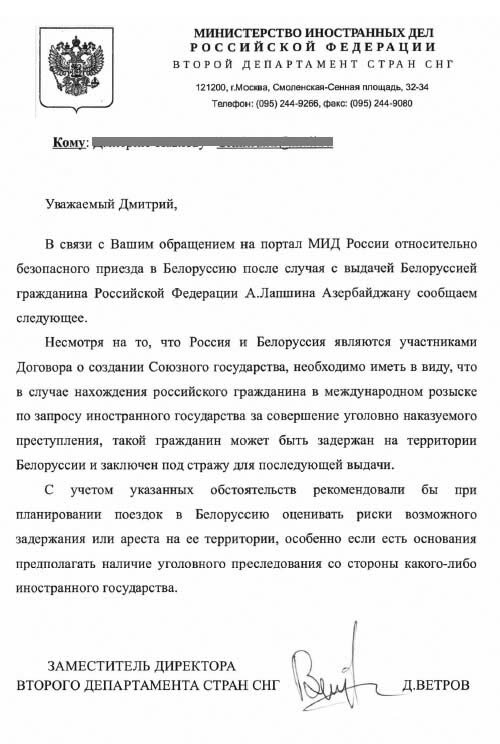 Интересный ответ из МИД России получил мой знакомый. Обратился он с вопросом, насколько безопасно россиянину посещать входящую в Союзное государство Беларусь? Вопрос совсем не банальный. Допустим, есть подозрения, что вас могут разыскивать власти США за то, что по их мнению вы тот самый мистический российский хакер, повлиявший на выборы и приведший к власти Дональда Трампа. Или какой-нибудь Азербайджан вас обвиняет в турпоездке в Нагорный Карабах. Можете ли вы посетить союзную Беларусь без опасений, что Батька вас выдаст американцам или продаст Ильхаму Алиеву, наплевав на союзные соглашения с Россией? Мне кажется, МИД России выразился дипломатично, но предельно четко по данному вопросу - белорусам доверять нельзя и ездить туда не рекомендуется. Ни слова осуждения в адрес человека, который мог нарушить закон. Наоборот, ему рекомендуют не ездить в Беларусь, чтобы его не поймали. Это называется язык дипломатии -