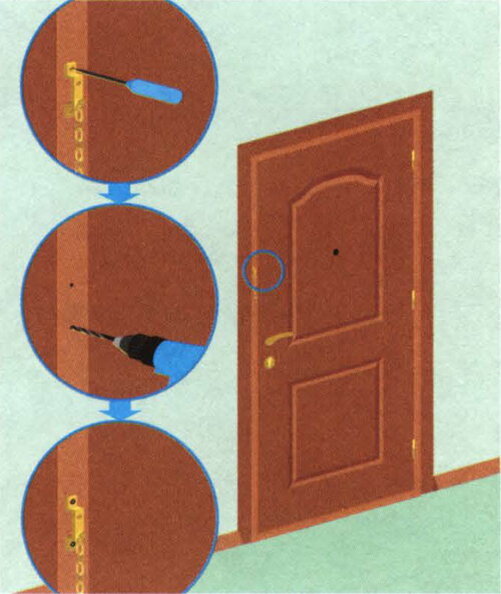 Металлическая дверная цепочка позволяет ограничивать открывание и хорошо видеть визитера через приоткрытую дверь, не опасаясь беспрепятственного проникновения в квартиру. Инструменты и материалы для работы: шило, электродрель, шуруповерт, отвертка. Как установить цепочку на дверь своими руками Сначала прикладываем основание цепочки к дверной коробке на уровне глаз. Шилом наносим отметки центров отверстий, насверливаем их и крепим основание саморезами. Затем устанавливаем запорную планку на одном уровне с основанием, горловина должна находиться в крайнем от коробки положении. Шилом делаем отметки для отверстий, сверлим и фиксируем планку на саморезы. В завершении вставляем стопор в горловину и доводим по каналу в крайнее к коробке положение.
