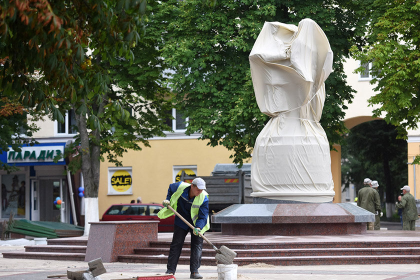 Фотофакт. Памятник братьям Лизюковым устанавливают на площади Победы
