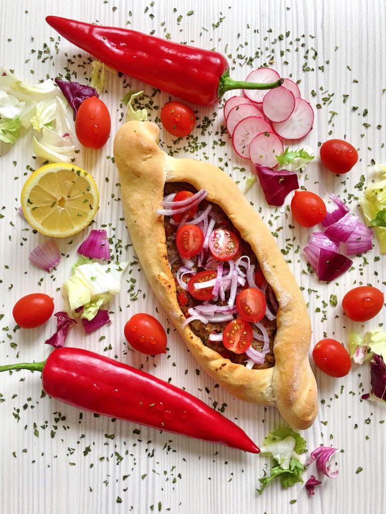 Lahmacun (также известный как турецкая пицца) является одним из моих любимых блюд. тесто: 460 г простой муки 250 мл теплой воды 35 г оливкового масла 2 чайные ложки соли 1 чайная ложка сахара (на закваску) 20 г (1/2 кубика) дрожжей начинка: 300 г говяжьего фарша 2 красных перца (нарезать мелкими кубиками) 1 красная луковица (ломтик) 2 луковицы (ломтик) 5 зубчиков чеснока (мелко нарезанный) 10 помидоров черри 2 столовые ложки качественного кетчупа 1 чайная ложка сладкого перца 1 чайная ложка римского тмина 1 чайная ложка молотого перца 2 чайные ложки соли 2 столовые ложки сушеной петрушки 2 столовые ложки оливкового масла Служить: лимонный сок, красный лук, помидоры черри + любой овощной салат Приготовьте дрожжи (дрожжи с примерно 10 г обычной муки, 1 чайную ложку сахара и порцию теплой воды - смешайте в жидком тесте) и дайте им подняться в теплом месте (около 10 минут). Поместите все ингредиенты для приготовления теста в блюдо кухонного комбайна, залейте закваску и дайте месильном