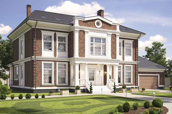 Дом может быть построен по любой современной технологии, которую выберет Заказчик или порекомендует архитектор. А вот облицовка стен декоративным кирпичом или камнем (предпочтительно в красно-коричневой цветовой гамме) – это традиционный атрибут стиля, который необходимо соблюсти. Контрастно смотрится использование белого декора, элементы которого могут размещаться в разных местах: