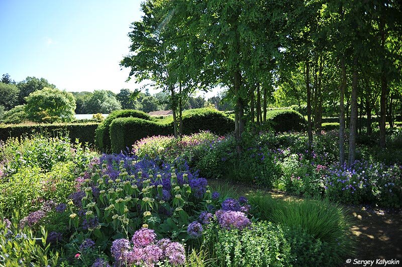Сегодня я побывал в трех садах, обнесенных каменными стенами, один из них - работы Удольфа. В Scampston Hall я не первый раз, и даже не знаю, когда он лучше выглядит - сейчас или осенью. Правильный ответ: всегда. В этом саду, который сделал знаменитый голландский дизайнер Пит Удольф, есть и огород, и сад цветов на срезку, и знаменитые молиниевые волны, и много что еще. Но я выложу пока только луговой цветник у фонтана. С двух сторон он ограничен самшитовыми бордюрами: весенним и осенним, с третьей - тенистой рощей из багряников, под которыми сейчас цветут герани и астранции, а с четвертой - оранжереей, в которой выставлены пеларгонии. Гулять по этому "цветущему лугу" - одно удовольствие, и можно там день провести, не заметив, как убежит время. Второй сад, Burton Agnes Hall Gaedens, произвел впечатление своими топиарными фигурами из тисса. Не знаю, как назвать эту форму: то ли капля, то ли пудинг. Здесь тоже есть сад в кирпичных стенах с огородными грядками и цветниками на срезку. Та