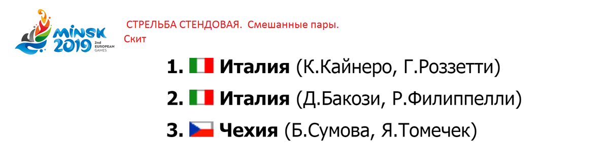 Здравствуйте, смотрим результаты 8-го дня, а затем таблицу. Начинаем со стендовой стрельбы. Круглый стенд. Итальянский дуэт Кайнеро и Россетти в финале обыграли соотечественников Бакози – Филиппелли. Чешские стрелки закрепились на третьем месте. Затем прошли соревнования в пулевой стрельбе. Малокалиберный пистолет. Расстояние 25 м. Немцы заняли два первых места. Сборная Германия, от которой вчера несколько раз уходило золото, завоевала свою 5 медаль высшего достоинства. Украинская команда отстрелялась на бронзу. Кто не знает, сегодня было разыграно 12 комплектов наград. Греко - римская борьба у женщин. Весовая категория до 50 кг. Мария Стадник из Азербайджана получила золотую медаль. Серебро у Оксаны Ливач из Украины. Болгарка Селишка и турчанка Демирхан выиграли поединки за бронзу. До 57 кг. Золото у Беларуси. Болгарская представительница на второй позиции. Молдавская и азербайджанская атлетки поделили третье место. До 62 кг. Юлия Ткач (Украина) победила в схватке за первую
