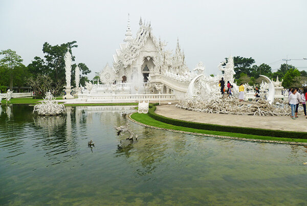 Ват Ронг Кхун такой белый, что кажется странным для храма в Юго-Восточной Азии. Мы привыкли видеть в украшениях культовых сооружений яркие краски и блеск золота. А здесь – ничего этого нет.