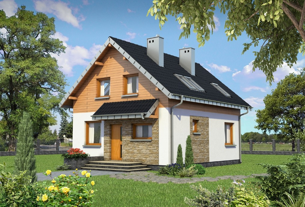 Если объектом вашего поиска является небольшой одноэтажный дом с мансардой, данный проект может быть хорошим предложением. Дом будет быстрым и относительно недорогим в строительстве благодаря компактной форме, запланированной на прямоугольном плане, и двускатной крыше, покрывающей его. Главный вход, запланированный на двускатной стене, был прикрыт небольшой крышей. Привлекательность проекта - терраса, примыкающая к задней стенке, с которой можно выходить прямо в сад. Это хорошее место, чтобы организовать барбекю на выходные с любимыми. Проект привлекает внимание к со вкусу сочетанию отделочных материалов. Белая штукатурка в сочетании с современной, деревянной облицовкой и камнем. Вся дополняется остекленными балюстрадами. Благодаря большому остеклению был обеспечен хороший доступ солнечного света к внутренней части дома. Дизайн дома в дополнение к своему красивому внешнему виду характеризуется функциональным интерьером. Этот дом идеально подходит для тех, кто предпочитает уютные комн