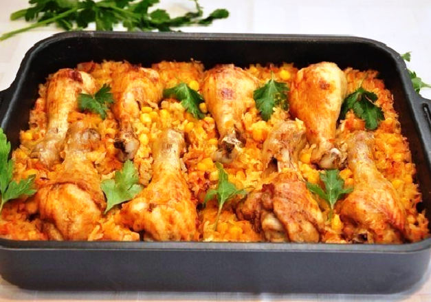 Бюджетное и вкусное блюдо! Мне нравится то, что готовится все сразу в одной посуде: тут вам и мясо, тут вам и вкуснейший гарнир к нему. Для выходного дня самое оно - не надо много тратить своего драгоценного времени, как говорится - все сложили и забыли)) А в результате получается много и вкусно)) Если у вас в хозяйстве найдется большая, глубокая сковорода со съемной ручкой, так и вообще считайте что вам повезло вдвойне - можно все сразу в ней и обжарить и запечь. Но в мою сковородку к сожалению все не поместилось, так что пришлось пачкать еще и форму)) Но все равно, мне очень понравилось, делюсь. Нам понадобится: 8 не очень крупных куриных голеней стакан сухого риса баночка консервированной кукурузки по 2 средних луковицы и морковки немного подсолнечного масла пол литра обычной питьевой воды соль, молотая сладкая паприка, перец - по вкусу. Рецепты вкусных блюд с курицей можно посмотреть еще здесь: Курица в духовке вместе с гречкой и грибами Сочное куриное филе по-французски (с ана