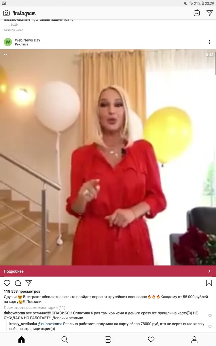 Листала я страницу в инстаграме, где красочно сияла реклама Леры Кудрявцевой в красном платье. Там она говорила про беспроигрышную возможность получить деньги и подарки, а под видеороликом комментарии о том, как все счастливы, что им пришли халявные деньги... Думаю, наверно, подкупные комментарии, но давай рискну... Начала проходить опрос с нелепыми вопросами типа какие напитки предпочитаю или какую марку часов и в конце Тра-та-там! Мой выигрыш 117000 рублей, но надо что-то оплатить на сумму 200 с хвостиком..Думаю, ну что там 200 рублей? Рискну! Оплатила, а дальше еще за что-то деньги просят...Думаю, Кудрявцевой не на руку обманывать людей, ведь на кону ее репутация! Опять оплатила...и так раз 10! И каждый раз думала, что надо остановиться, но жалко было уже потраченных денег. А в голове дума