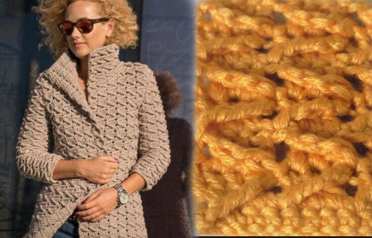 Думаю, что многие видели это пальто в интернете Схему этого узора мне скинула одна из моих подписчиц, и попросила сделать по нему мастер- класс, объяснив это тем, что крючок она только осваивает и никак не разберется со схемой, а ей хочется связать пальто таким узором, я попросила фото модели, но она сказала, что у нее нет. Любопытство взяло верх. Я стала искать это пальто и на просторах интернета нашла его, причем их оказалось огромное множество в разных цветах, но это мне понравилось больше всего. Описания к сожалению нет, но как видите модель не сложная, а смотрится шикарно. Узор вяжется просто, с ним справится дже новичок, единственное неудобство, но к нему быстро привыкаешь, это вывязывание вогнутых и выпуклых столбиков. Вот и схема вязания , думаю тут все понятно, даже с объяснениями, а если возникнут трудности, то можно посмотреть видеоролик ниже Здесь можно посмотреть как вязать такой узор Для вязания лучше брать более объемную пряжу и толстый крючок. Хотя я образец вяз