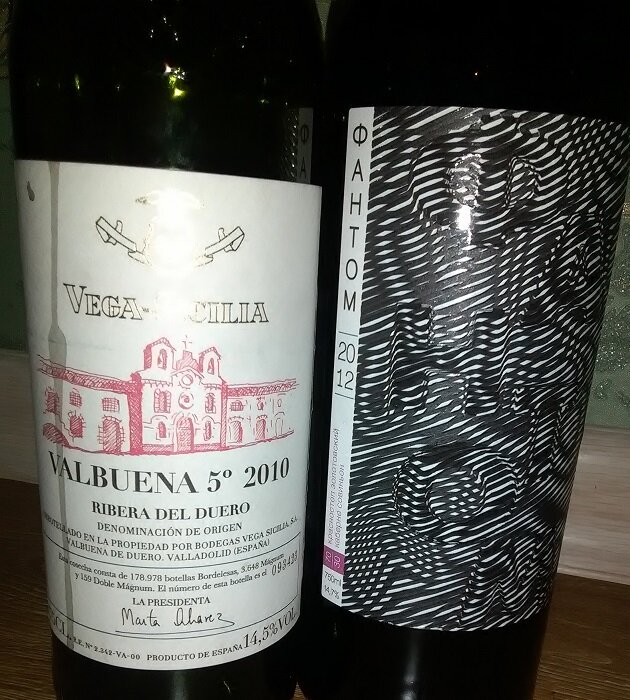 Vega Sicilia Valbuena 5 как великое испанское вино я попробовал первый раз в 2010 во время поездки в Мадрид. Цена в местном магазине была 87 евро (при отлёте в мадридском DF видел за 120 евро). Обалдел от вкуса, и купили это вино домой, где пили с женой и подтвердили шикарный вкус. При открытии для себя нашего вина "Фантом" в 2017 г долго имел цель сравнить эти вина. Вот, наконец, сравнение состоялось.