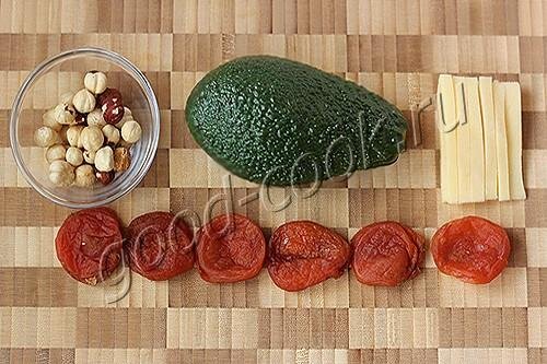 Кусочки кураги придают пикантность, но курагу обязательно нужно брать либо кислую, либо кисло-сладкую. СОСТАВ 1 авокадо (~200г), 30~50г кислой или кисло-сладкой кураги (5~10шт), 20г жареного фундука (17~20 ядер), 25г твёрдого или копченого колбасного сыра, 0,5 ч ложка сахара, 1~2 ч ложки лимонного сока, 2~3 ст ложки сметаны посмотреть калорийность»