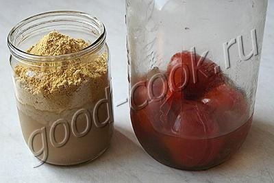 В 0,5-литровую банку сначала налить рассол, а затем сверху насыпать горчицу, соль и сахар. Всё тщательно перемешать, чтобы горчица вся стала мокрой.