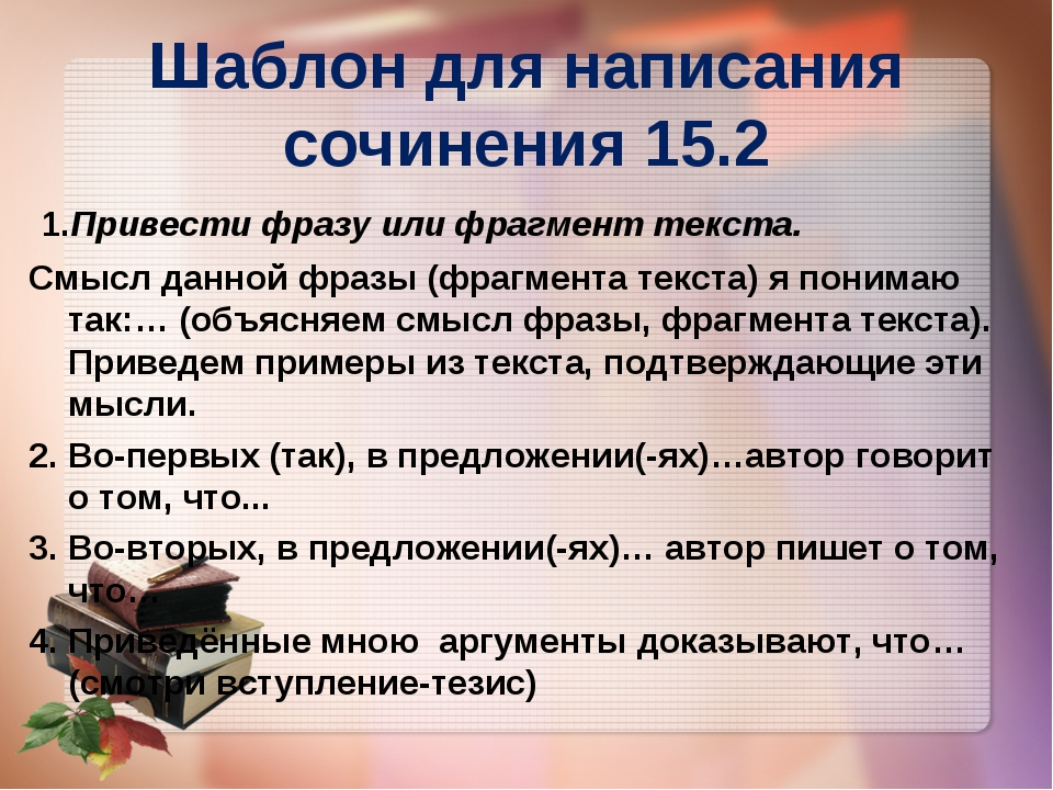 Работа над сочинением-рассуждением ОГЭ 19.2 Формулировка задания: Напишите сочинение-рассуждение. Объясните, как Вы понимаете смысл финала текста: «…». Приведите в сочинении два аргумента из прочитанного текста, подтверждающих Ваши рассуждения. Приводя примеры, указывайте номера нужных предложений или применяйте цитирование. Объём сочинения должен составлять не менее 70 слов. Структура сочинения-рассуждения 9.2. ОГЭ по русскому языку: 1. Вступление (несколько общих слов о проблеме, которая обозначена в тезисе, + сам тезис + предложение поразмышлять над поставленным вопросом). 2. Первый аргумент: пример + комментарий. 3. Второй аргумент: пример + комментарий. 4. Заключение (вывод по тезису, умозаключение). План работы над сочинением, рекомендации 1 абзац. Вступление. Размышление о смысле приведённой цитаты, обозначение значимых понятий, выражение намерения доказать правильность высказывания примерами из текста. - Текст заканчивается словами: "…". - На мой взгляд, речь идет о том, чт