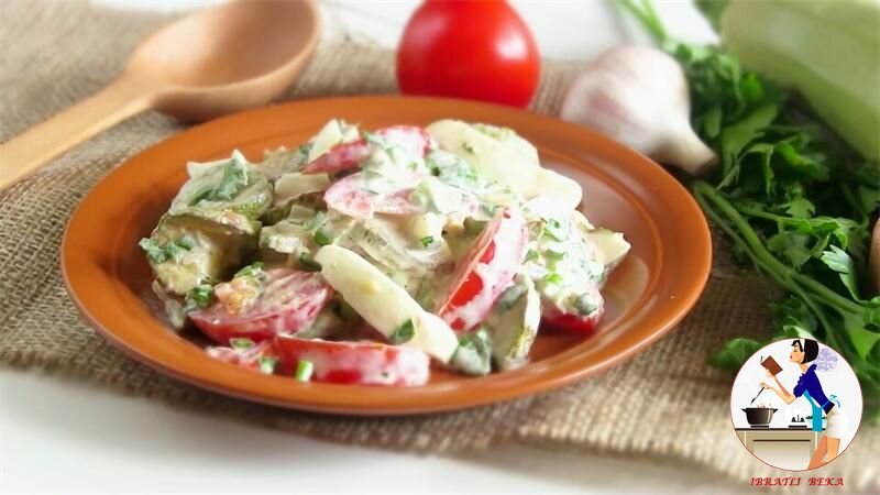 Yoz mavsumiga munosib, yengil va mazali salat retsepti bilan tanishing. Oddiy mahsulotlardan tayyorlangan, mazali salat yozning issiq kunlarida sizga va yaqinlaringizga juda ham munosib bo'lishiga hech ham shak-shubxa yo'q. Retseptni albatta saqlab qoling! Kerakli masalliqlar: Tayyorlash usuli: 1. Yuvilgan qovoqchani o'rtacha qalinlikda, yumaloq shaklda kesing. Tuz seping va 10 daqiqaga qoldiring. Tuxumni suvda butunlay tayyor bo'lguncha pishiring. 2. Qovoqchani tovada qizdirilgan o'simlik yog'ida, har tomonlama qovuring va oshxona sochig'iga oling. Ortiqcha yog'i ajralishi uchun. 3. Pomidor va tuxumni bo'lakcha qilib kesing va qovoqcha bilan salat tayyorlanadigan idishda uchrashtiring. 4. Ko'k piyoz, petrushka va sarimsoqni mayda to'rg'ang. Salat idishidagi mahsulotlar bilan birlashtiring. 5. Smetana, tuz va murchni soling. Aralashtiring. Ta'bga ko'ra smetanani mayonez yoki tabiiy yogurt bilan almashtirishingiz mumkin. 6. Tayyor salatni darhol dasturxonga torting. Mazali va yengil sal