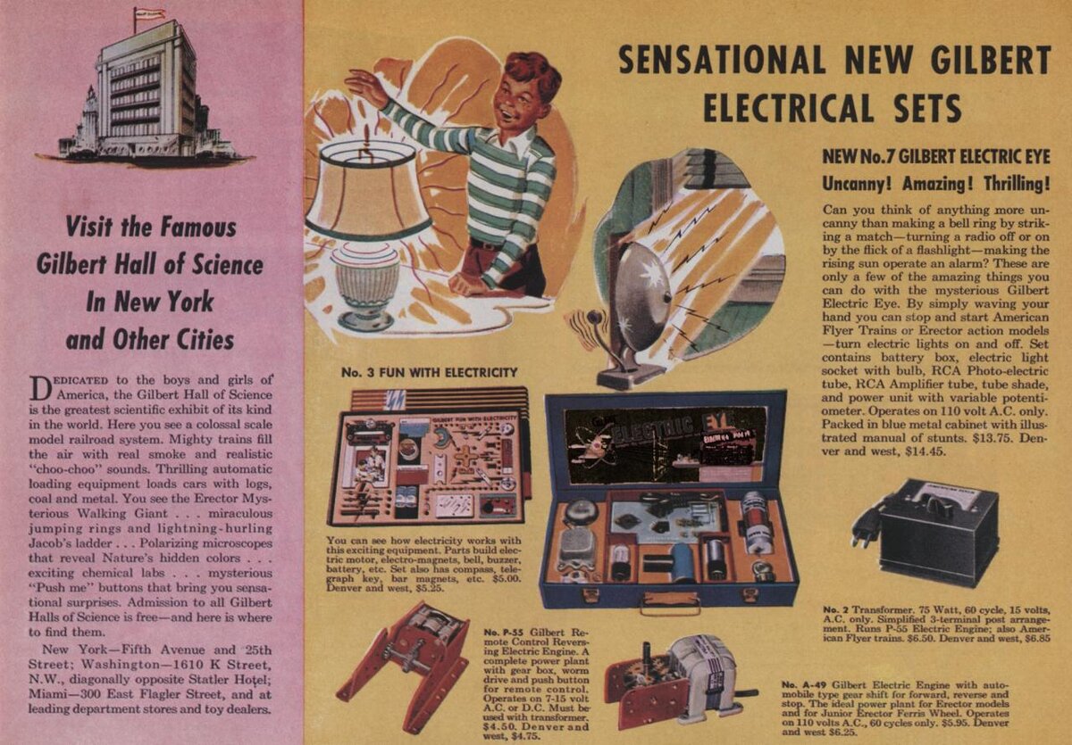 Одной их самых известных компаний, выпускающих химические наборы, была компания AC Gilbert Company, основанная олимпийским чемпионом по прыжкам с шестом Альфредом Гилбертом. Гилберт был уверен, что его игрушки будут вдохновлять мальчиков на эксперименты — и во многом оказался прав. На его металлическом конструкторе и х