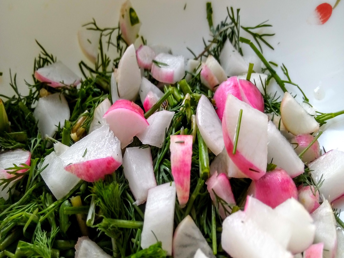 Выложить кусочки огурца и пластинки редиски, не перемешивать эти компоненты, Добавить нарезанный укроп. Шаг 2: Сбрызнуть приготовленный легкий весенний салат смесью из бальзамического уксуса и кунжутного масла, по вкусу приправить перчиком и посолить, затем присыпать измельченными листиками свежей мяты и подавать к столу. Приятного аппетита!
