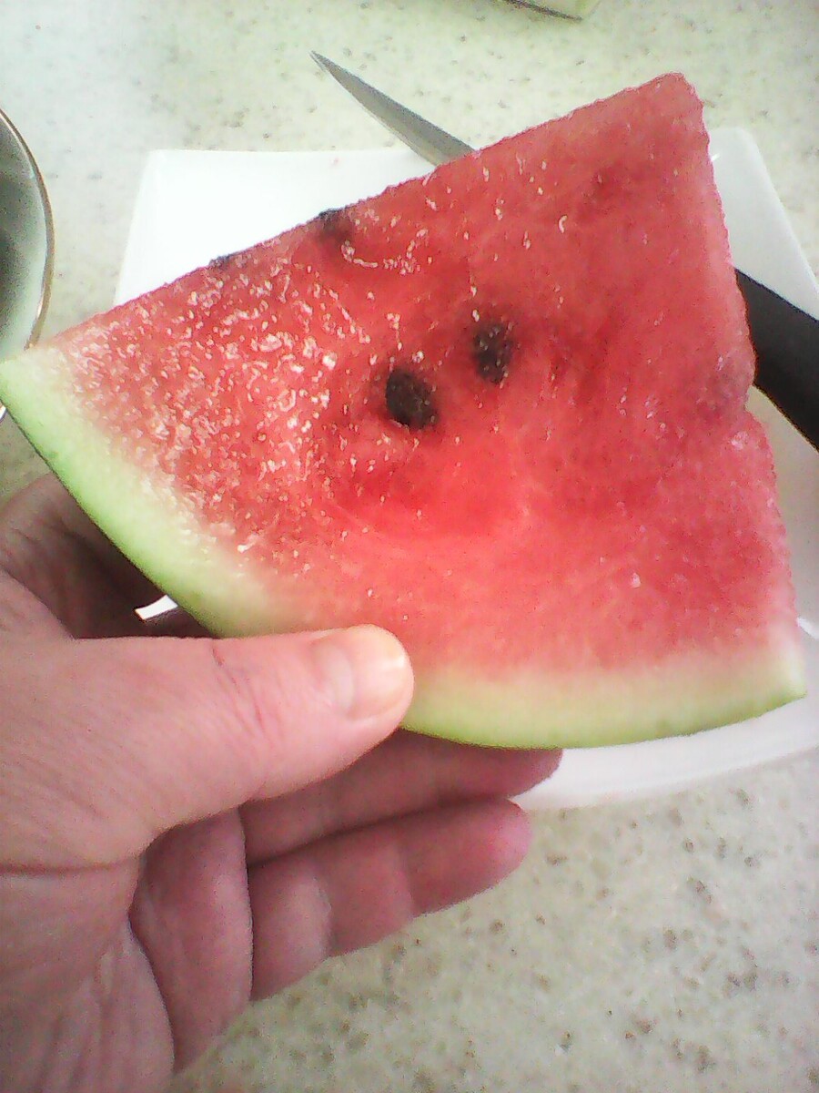 Выждал сутки, чтобы проверить последствия и решил таки написать пост. Зашёл на рынок купить помидоров. Огурцы уже свои в тепличке, как пару недель собираем. Увидел в продаже арбузы и дыни. Ребенок давно уже просил "арбузик". Своим умом прекрасно понимаю, что бахчевые лучше покупать ближе к сентябрю. Но попробовал взрезанный арбуз и понравился. Торговец-узбек, говорит что "дагестанский", но не знаю, на нём ведь "made in" не написано. Купил еще узбекские нектарины(манго и яблоко). Постоянно такие покупаю, очень сочные и сладкие. Цена уже нормальная -120 рублей за кило. Арбуз пока дороговат, взял 5-ти килограммовый за 200 рублей(40р. за 1кг.)С каждой неделей цена будет падать и в августе до привычных 10 рублей дойдет. Принес домой, охладил до вечера в холодильнике. И вечером всей семьей с удовольствием съели... На вкус сладкий, но немного водянистый. Косточек очень мало и кожура тоненькая. Переживал за последствия, но прошли сутки и никаких проблем! Купил еще дыню-торпеду. 100 рублей за