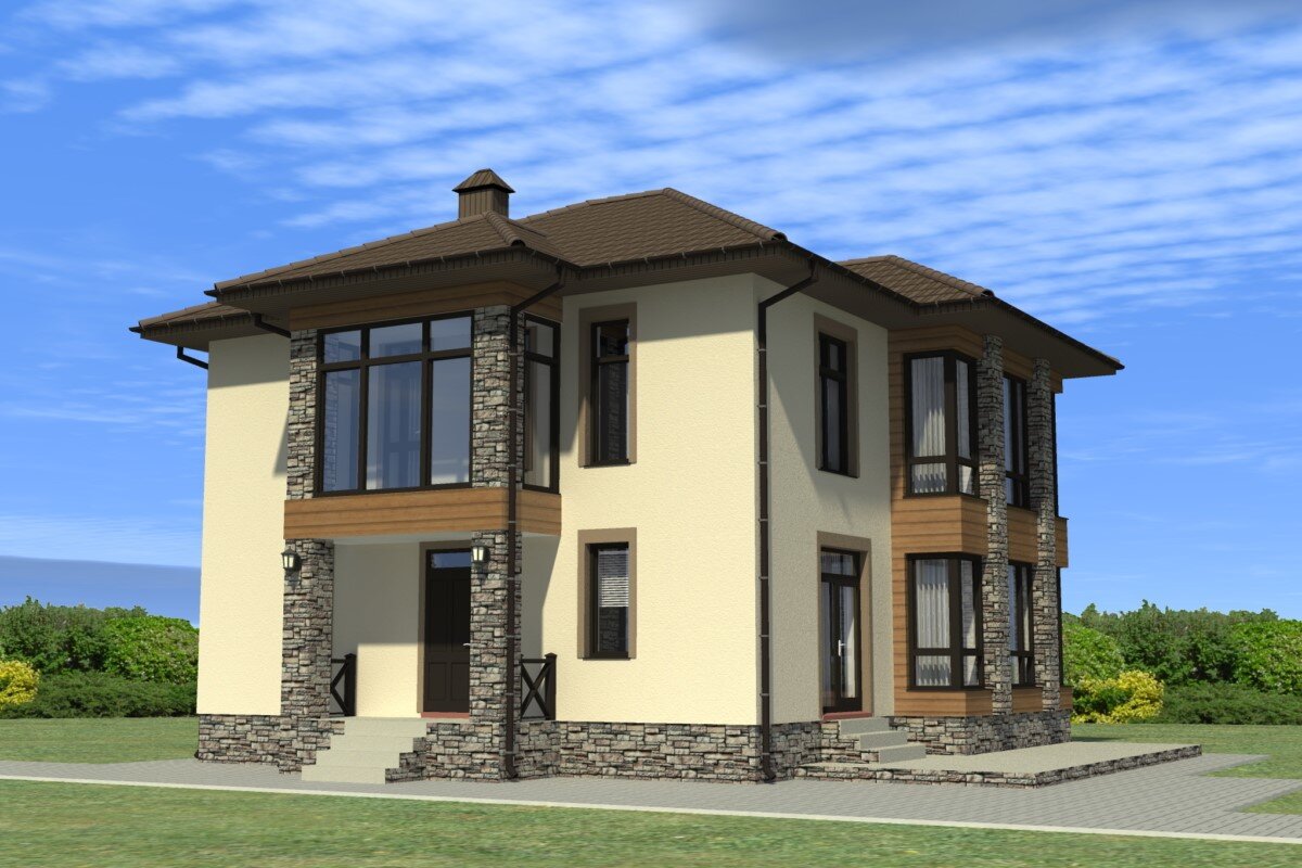 Современный дом предназначен для проживания семьи из пяти человек. Сливочного цвета штукатурка стен гармонирует с цоколем и колоннами «под камень».
