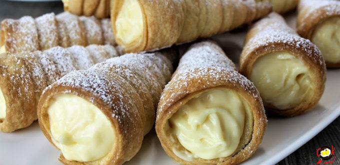 Сладкие трубочки с нежным белковым кремом. При желании десерт можно украсить лепестками миндаля, сахаром или сахарной пудрой. Набор ингредиентов: Рецепт приготовления слоеных трубочек с белковым кремом: Если слоеное тесто было замороженное, то предварительно разморозить. Затем раскатать лист толщиной примерно 4-5 мм. и разрезать на полоски шириной около 2-3 см. Взбить с помощью вилки пару куриных яиц и смазать полоски теста. Это позволит получить румяную корочку. Для формирования трубочек можно использовать специальные металлические конусы или сделать такие конусы самостоятельно из плотной бумаги. Намотать полоски слоеного теста на специальные конусы снизу вверх. Заготовку трубочек можно с наружной стороны слегка посыпать сахаром и сбрызнуть водой. Уложить на противень, выпекать при 180 градусах. Когда верх подрумянится, это значит трубочка из слоеного теста готова. Остудить и освободить от конусов, наполнить белковым кремом. Для приготовления белкового крема взять охлажденные яйца, о