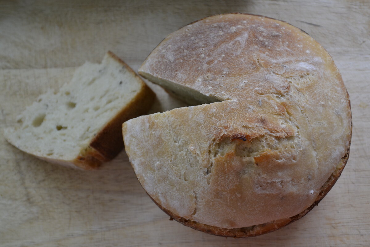 Сперва нужно приготовить опару Для опары нужно: 2 стакана пшеничной муки 2 стакана воды 2 ст.л. кефирной закваски Все хорошо перемешать, чтобы не было комочков, накрыть полотенцем, марлей или крышкой с дырочкой. Я замешиваю в кастрюле, к которой прилагается такая крышка с дырочкой для пара. Крышка прозрачная, поэтому сверху я укутываю все махровым полотенцем. Опару нужно оставить часов на 12-14. Все зависит от температуры в помещении, просто следите за поведением опары. Когда много пузырей, опара готова. Тесто Когда опара подойдет, добавьте в нее: 2,5 стакана муки 2 ч.л. соли 2ч.л. сахара Тмин (по желанию) Хорошенько вымешайте тесто. Если вы, как и я, любите тмин, смело добавляйте полную столовую ложку. Можно добавить и кориандр, если любите. Смажьте форму растительным маслом, выложите в него тесто и оставьте подходить под полотенцем или крышкой с дырочкой на 2-4 часа. Тесто должно подняться. Возможно, оно поднимется не в два раза, а чуть меньше – ничего страшного хлеб все равно пол