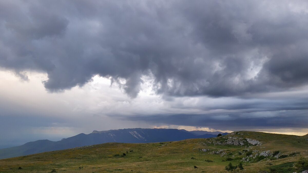 Хочу вам рассказать про вчерашнюю прогулку на Верхнее плато Чатыр-Дага. В очередной раз убедился, что чем хуже погода, тем лучше для фотографа. Такой скверной погоды, как сегодня, я припомнить не могу. В Симферополе было по-летнему тепло, светило солнце, по синему небу бежали кудрявые белые облака, и мы решили сгонять на закат на вершину Чатыр-Дага (Эклизи-Бурун, 1527м). На подъёме было прохладно, дул ветер, из тяжёлых тёмно-серых облаков срывался дождь. С высотой порывы ветра усиливались, а дождь становился все настойчивее. Причем за нашей спиной сияла освещённая солнцем Демерджи, а за ней просматривались горы до самого мыса Меганом. За спиной была благодать, а впереди - штормовой фронт, который быстро двигался нам навстречу. Наверху черные грозовые облака, над соседней горой - стена дождя, которую разворачивает на нас ветер, поменявший направление и швыряющий в лицо крупные ледяные капли. Какой там закат! Решаем разворачиваться и бегом вниз, пока нас не закрутило в этом адском кот