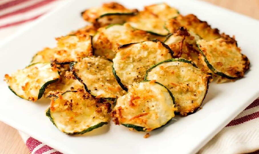 С аппетитной сырной корочкой хрустят даже запеченные кабачки. Отменная закуска. Состав: кабачки – 1 шт.; натертый твердый сыр – 2 ст. л.; яйцо – 1 шт.; прованские травы — 1 щепотка; соль, молотый перец – по вкусу; панировочные сухари – 4 ст. л. Приготовление: 1. Кабачок нарежьте кружочками шириной 1 см. 2. В миске смешайте сыр, панировочные сухари, соль, перец, прованские травы. 3. В отдельной емкости взбейте яйцо. 4. Каждый кусочек кабачка обмакните в яйцо и обваляйте в панировочной смеси. 5. Противень смажьте маслом. Выложите на него подготовленные кружочки кабачков. 6. Запекайте 7-10 минут в разогретой до 200 градусов духовке. 7. Достаньте противень. Переверните кружочки. Запекайте кабачки до румяной корочки еще 5-7 минут. Подавайте с чесночным соусом.