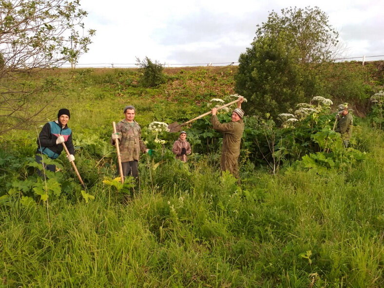 Куныр авылы яшьләре күмәкләшеп борщевек чабарга чыккан. Бу кадәргесе берни эшләмәгән кебек булмас, көрәштә һәр ысул яхшы, ди алар.