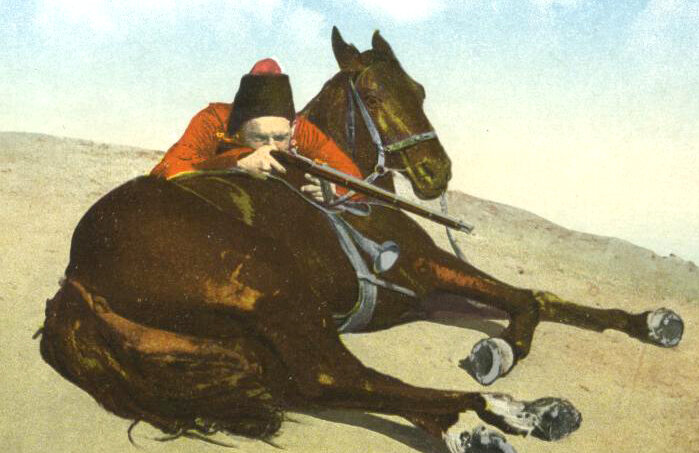 Очередная погоня за степняками угоняющими лошадей и скот могла обернуться тем, что казаки натыкались на превосходящие силы противника. Так бывало когда казаков специально заманивали в западню. Выстоять в открытом бою если на каждого из казаков приходилось по 5, а то и 10 соперников было невозможно. Спастись бегством тоже нет шансов. Верная смерть. Кони устали от погони, а противник на свежих, не утомленных гонкой лошадях только и ждал когда казаки покажут спины, чтобы "принять" их в пики. Если конечно застава была не так далеко, то шанс организованно отступить был, но вот если дело происходило далеко в степи то вариант для спасения был один - сделать из коней "живую крепость". Казаки спешивались. Коней "сбивали в кучу" и переплетали их поводья, чтобы они при атаке степняков не разбежались. Казаки, припав на колени, прижимались к лошадям, получая хорошее укрытие из-за которого можно было вести огонь из винтовок. Кочевники, как правило, "с горяча" атаковали всей массой конницы один-