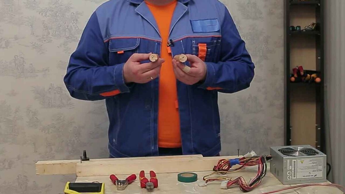 К этим же брускам с обратной стороны подключите к медной проволоке провода от блока питания. Полярность значения не имеет. Провода можно не изолировать, поскольку силы тока блока питания не хватит, чтобы нанести человеку вред.